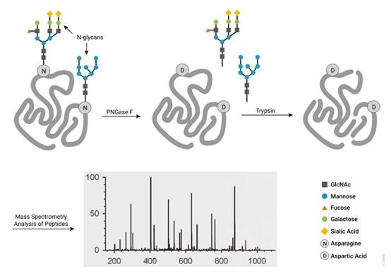 ▲蛋白質中N-醣基化位點的鑑定Asn連接的醣鏈可透過PNGase F進行酵素切除,產生完整的寡醣結構以及去醣基化的蛋白質。在此過程中,位於N-醣基化位點的Asn residues會轉換為Asp。